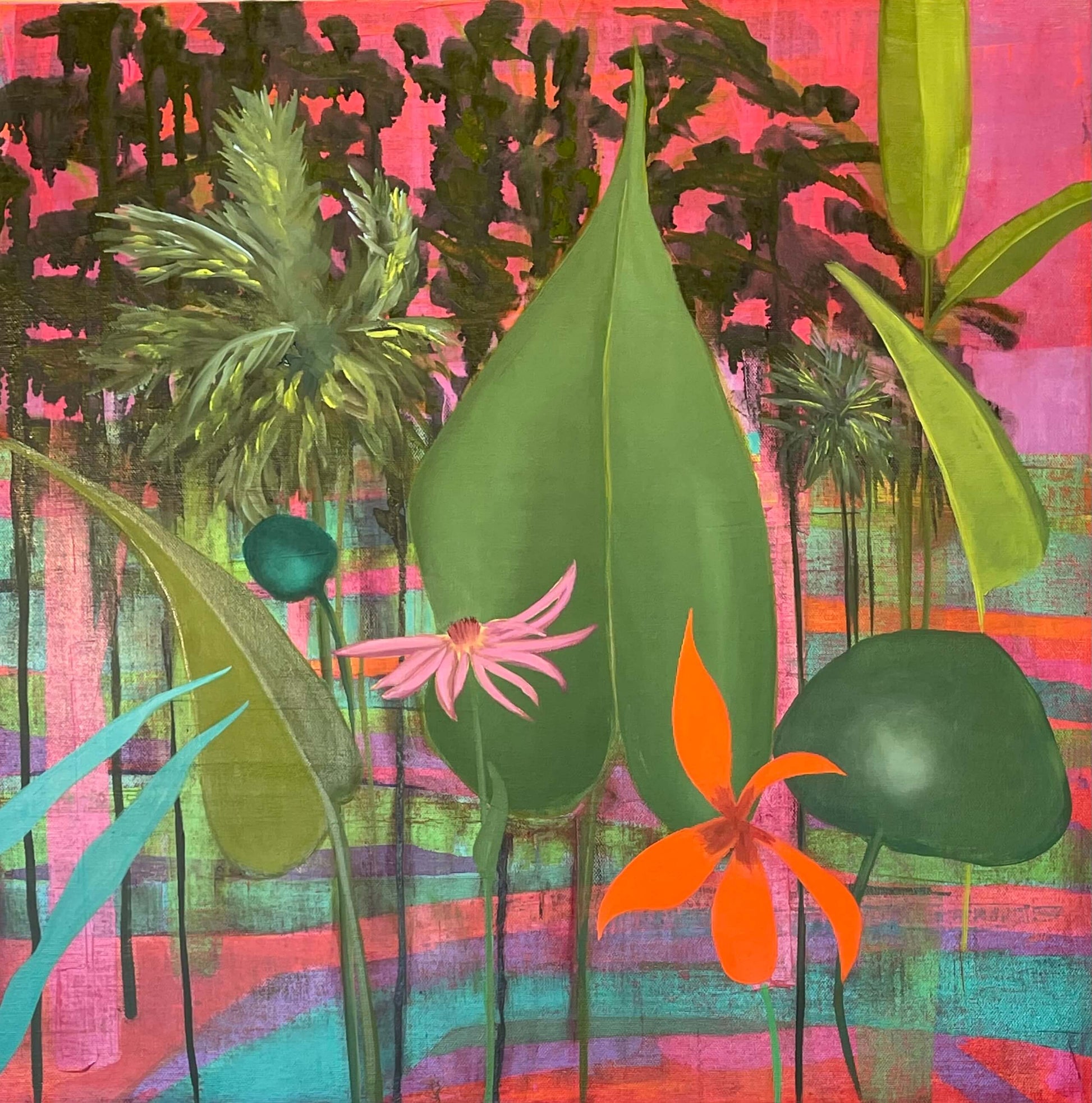 Flora and geometry conjoin as multiple sensorial tiers of abstracted paint.